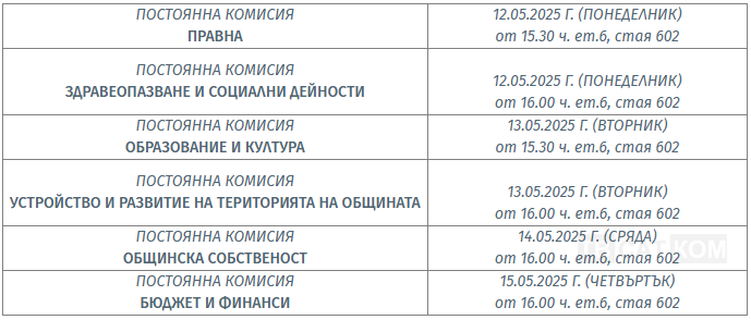 ГРАФИК НА ЗАСЕДАНИЯТА НА ПОСТОЯННИТЕ КОМИСИИ ПРИ ОБЩИНСКИ СЪВЕТ – АСЕНОВГРАД ЗА ПЕРИОДА 12.05-15.05.2025 година: