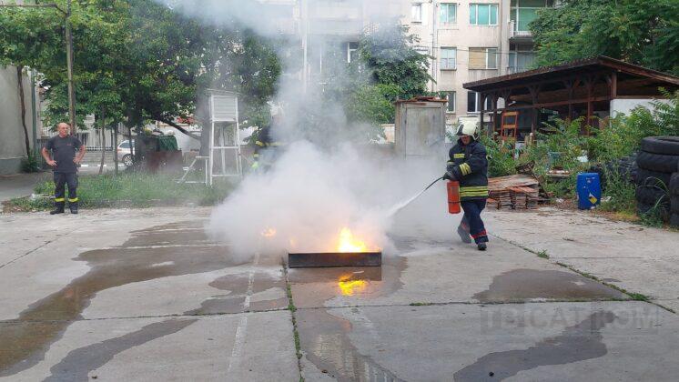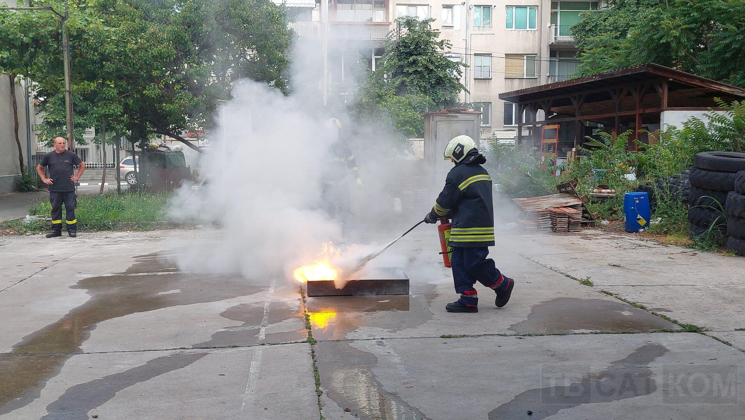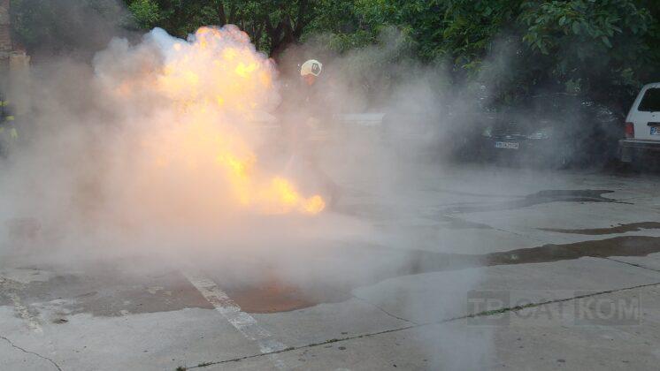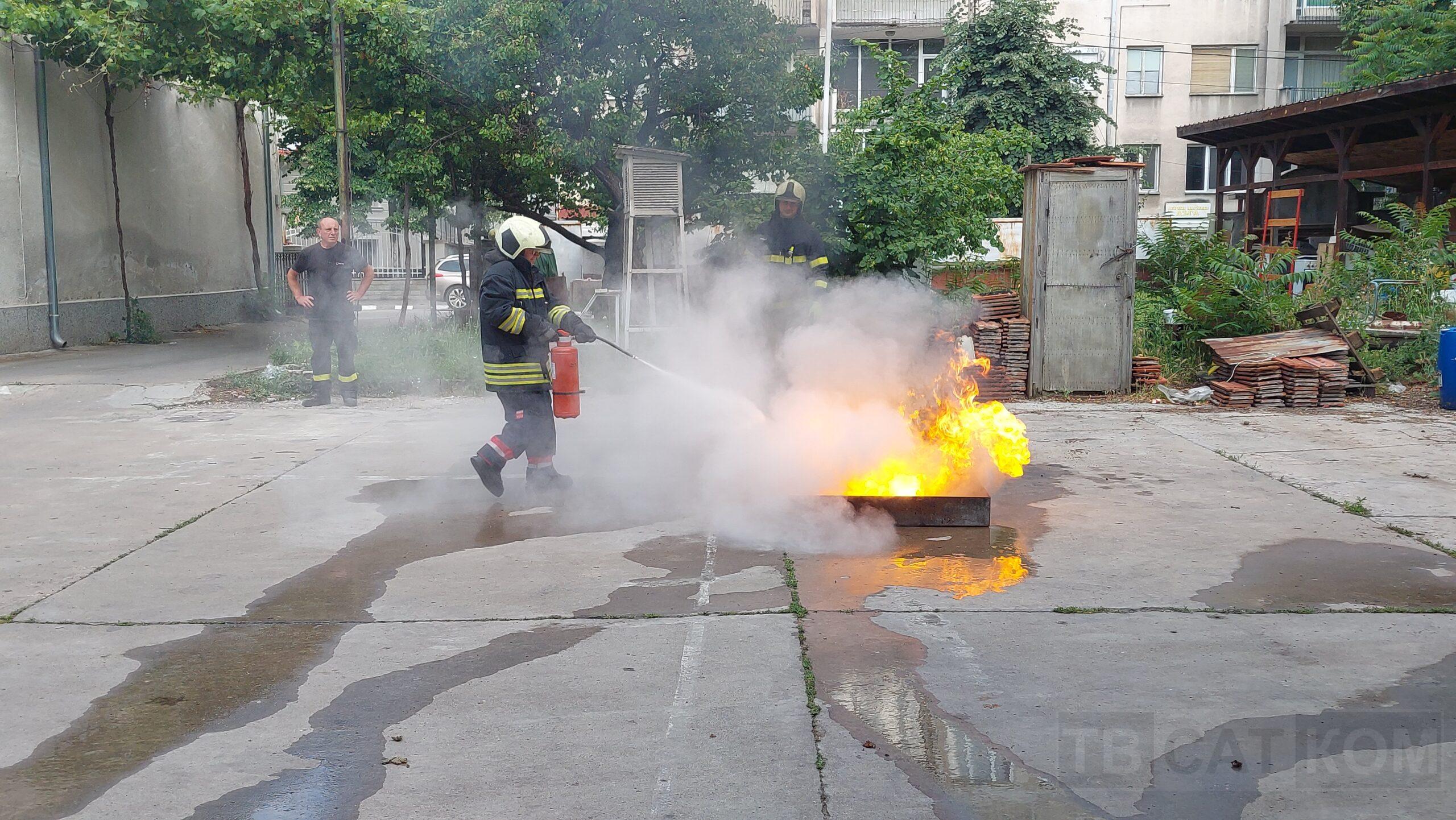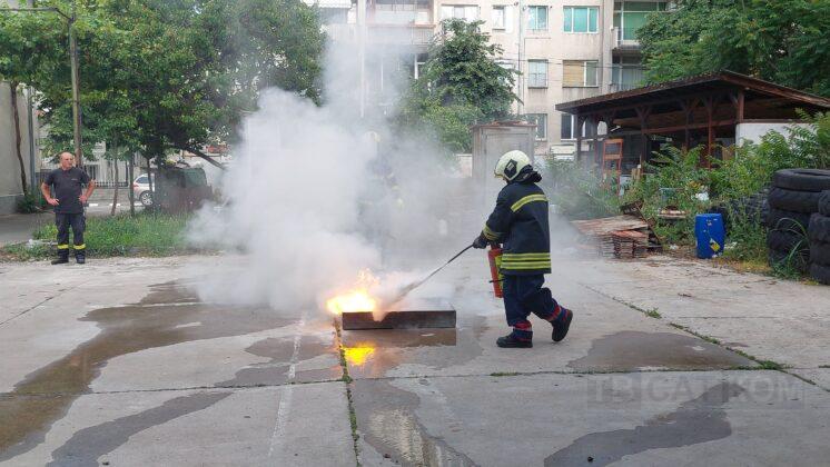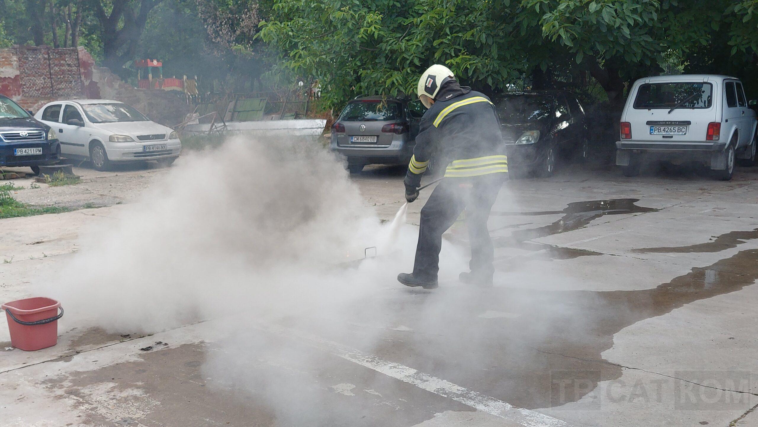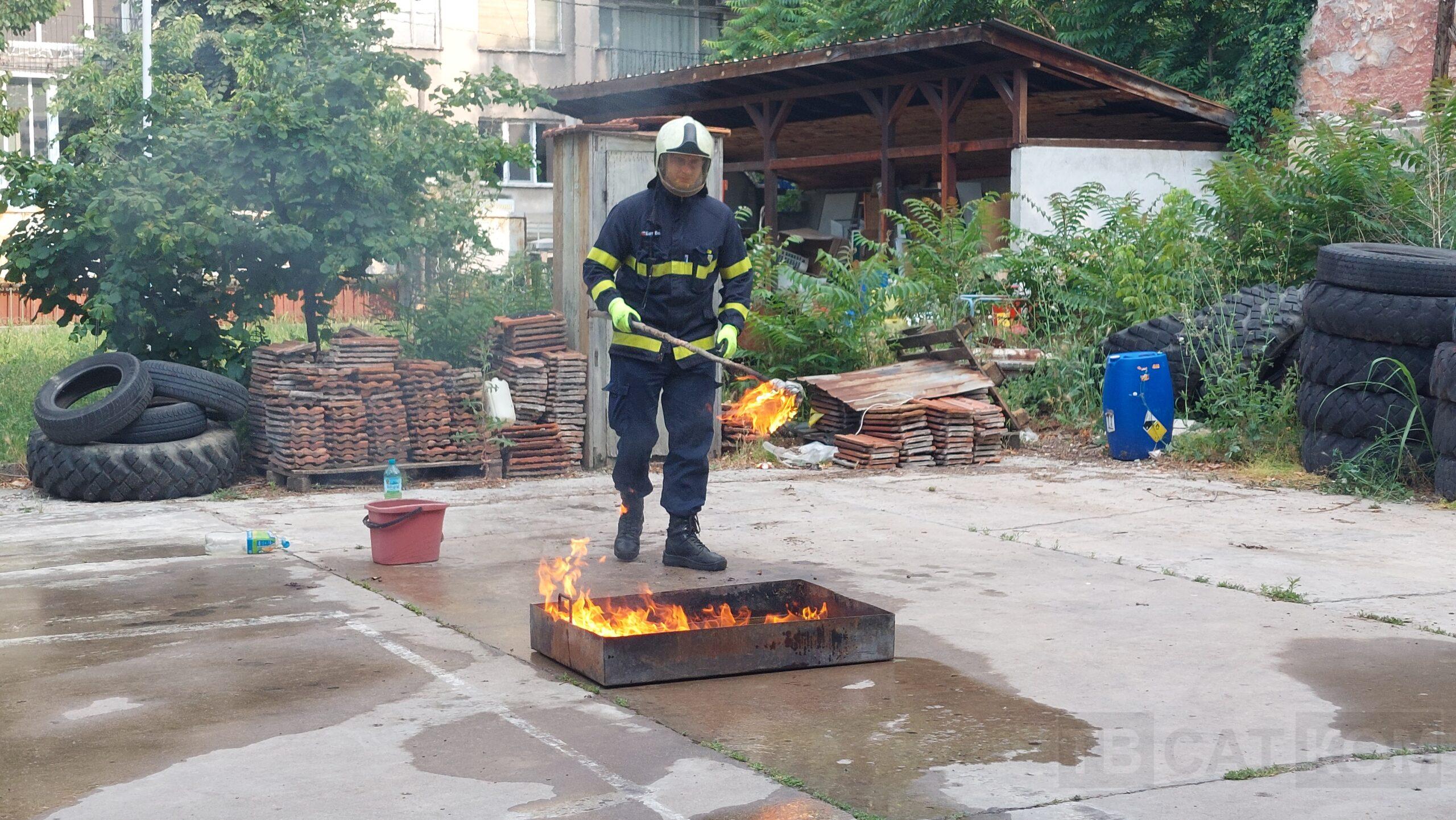 – „Гасене на тава с прахов пожарогасител“;