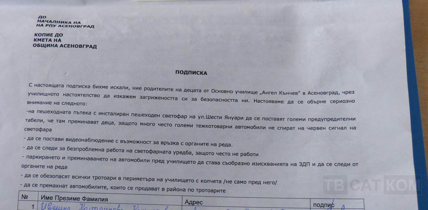 Училищното настоятелство към ОУ „Ангел Кънчев“ инициира подписка. Сред изложените искания в нея са: поставяне на видеонаблюдение на светофара находящ се на ул. „6-ти януари“ в Асеновград; монтиране на големи светещи предупредителни табели информиращи водачите, че там преминават деца, както и по-често и повече полицейско присъствие в района. Желанията на родителите включват и проследяване работата на светофарната уредба, поради факта, че много често тя не работи; също така и премахване на автомобилите, които са обявени за продан и са позиционирани по тротоарите в района на училището; монтиране на повече циментови блокчета възпрепятстващи паркирането около школото. Според председателя на училищното настоятелство – Екатерина Гешева, предложените промени се налагат заради това ,че там ежедневно пресичат множество ученици, а много често преминаващите товарни камиони карат с висока скорост и се случва да не спрат, дори и при червен сигнал на светофара. Всеки родител или гражданин решил да подкрепи предложенията може да го направи през следващите две седмици. Подписката е поставена на входа на сградата на ОУ „Ангел Кънчев“ и всеки може да я подпише. След като се съберат подписите, тя ще бъде внесена на вниманието на кмета на община Асеновград, както и в РПУ – Асеновград. От училищното настоятелство призовават за активност, поради факта, че това се прави за доброто на децата и жителите на града.