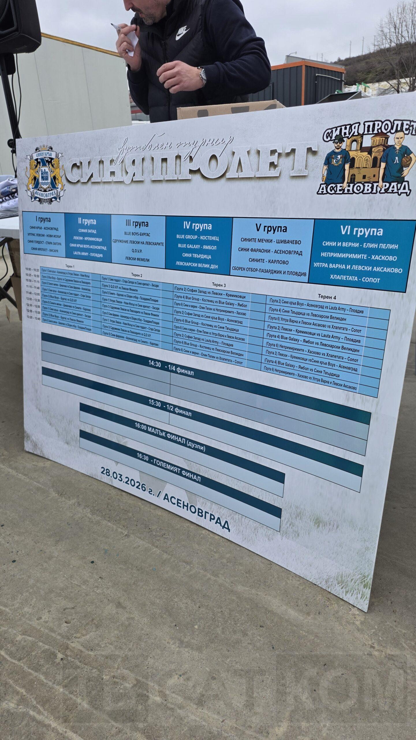 Фенове на ПФК „Левки“ от различни краища на страната се събраха в събота, 28-ми март, в Асеновград. Привържениците на столичния тим се включиха във футболния турнир на малки врати „Синя пролет“, който се провежда за пореден път, но за първа година е в Асеновград. Двубоите между сформираните от синята общност отбори се играха на игрището с изкуствена настилка „Арена Шипка Старс“, намиращо се на изхода на града. Въпреки дъждовното време, мачовете се изиграха с много настроение и хъс за победа. Но големият победител, разбира се, е само един и той е един от отборите, представящ Асеновград, а именно – „Синя кръв“.