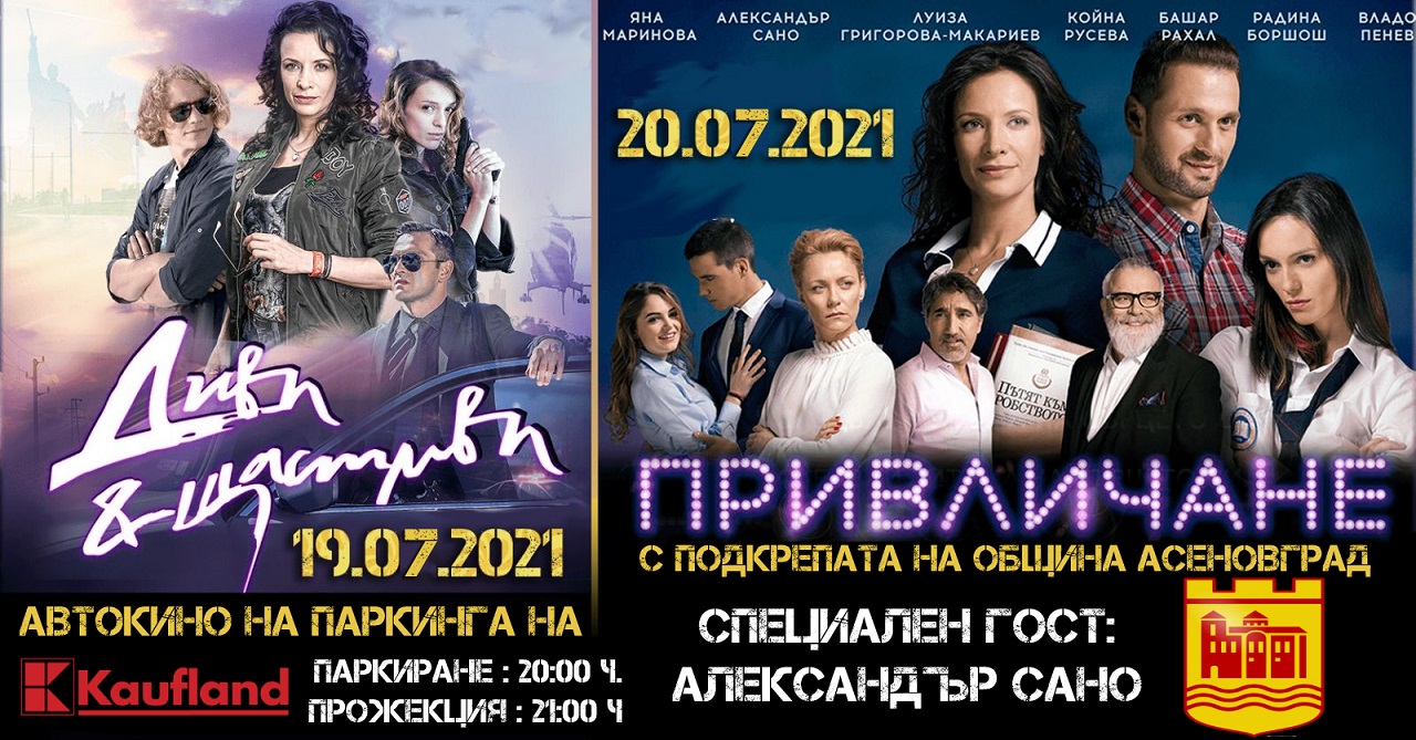 Остават броени часове до началото на първата прожекция от гостуващото автокино в Асеновград. Първият филм, който зрителите ще могат да видят, ще се излъчи утре – 19.07.21 г. „Диви и щастливи“, а на 20.07.21 г.е прожекцията „Привличане“. Обявеният час за паркиране, след който зрителите могат да започнат да пристигат с автомобилите си за автокиното, е 20:00 ч., а началото на прожекциите и в двете вечери ще е 21:00 ч. Мястото е паркингът на големия хипермаркет в кв. Запад. Автокиното ще бъде безплатно за посетителите, благодарение на финансовата подкрепа на община Асеновград.
