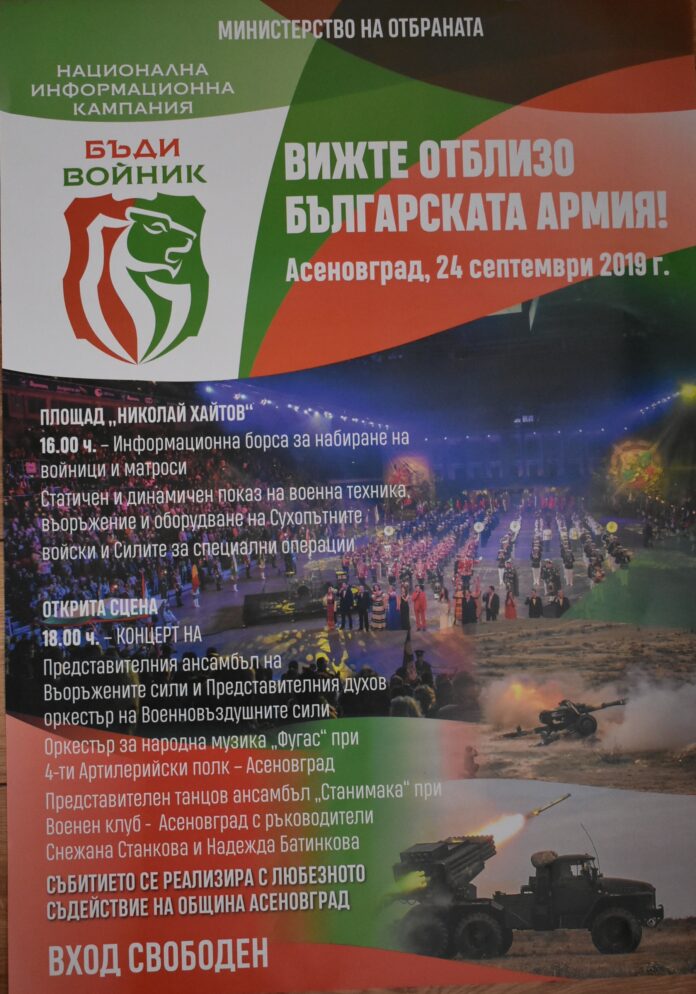 Министерство на отбраната със съдействието на Община Асеновград ви канят на 24 септември на площад „Акад. Николай Хайтов”, където ще се проведе националната информационна кампания „Бъди войник” под надслов „Вижте отблизо българската армия!”.