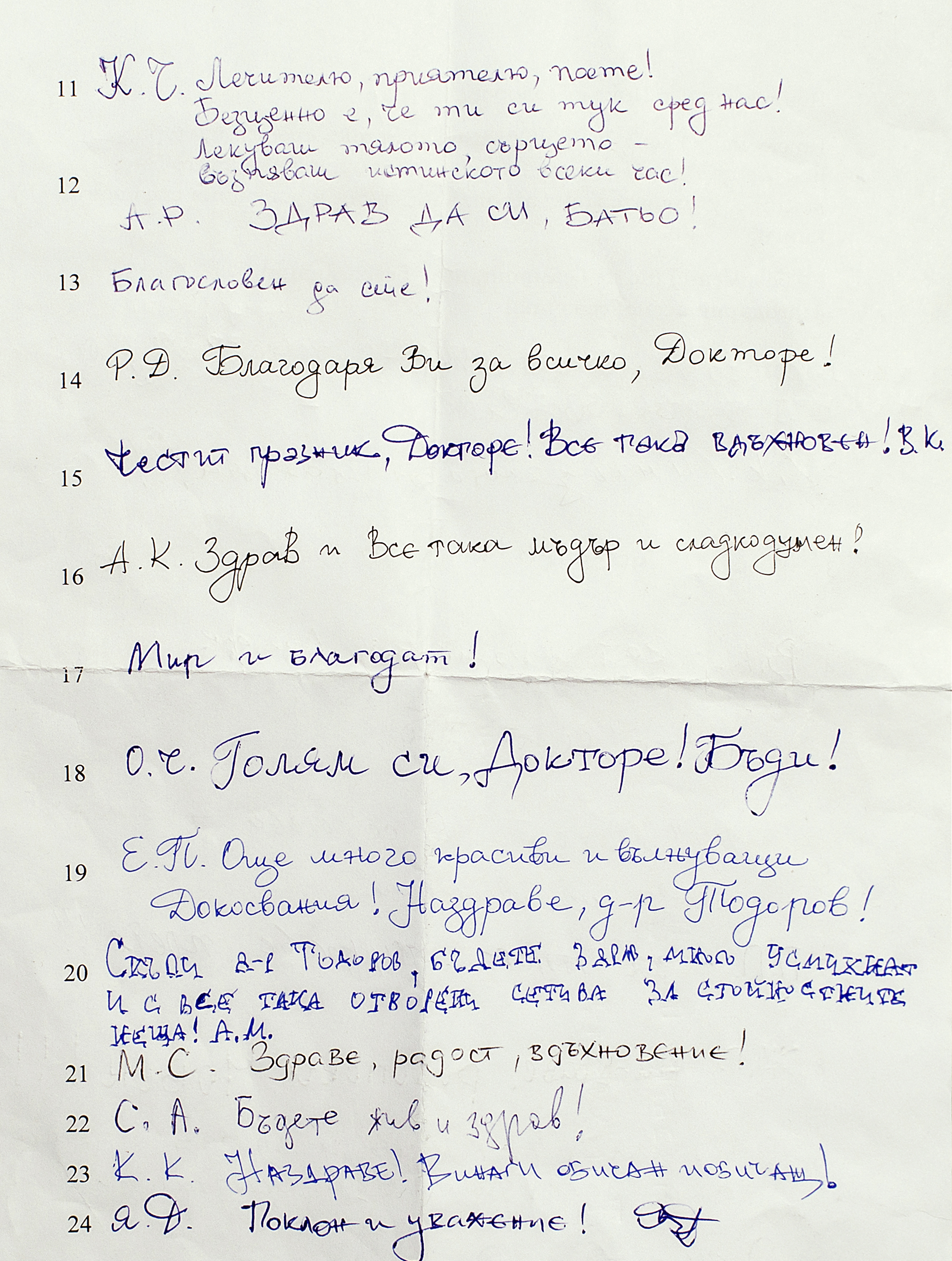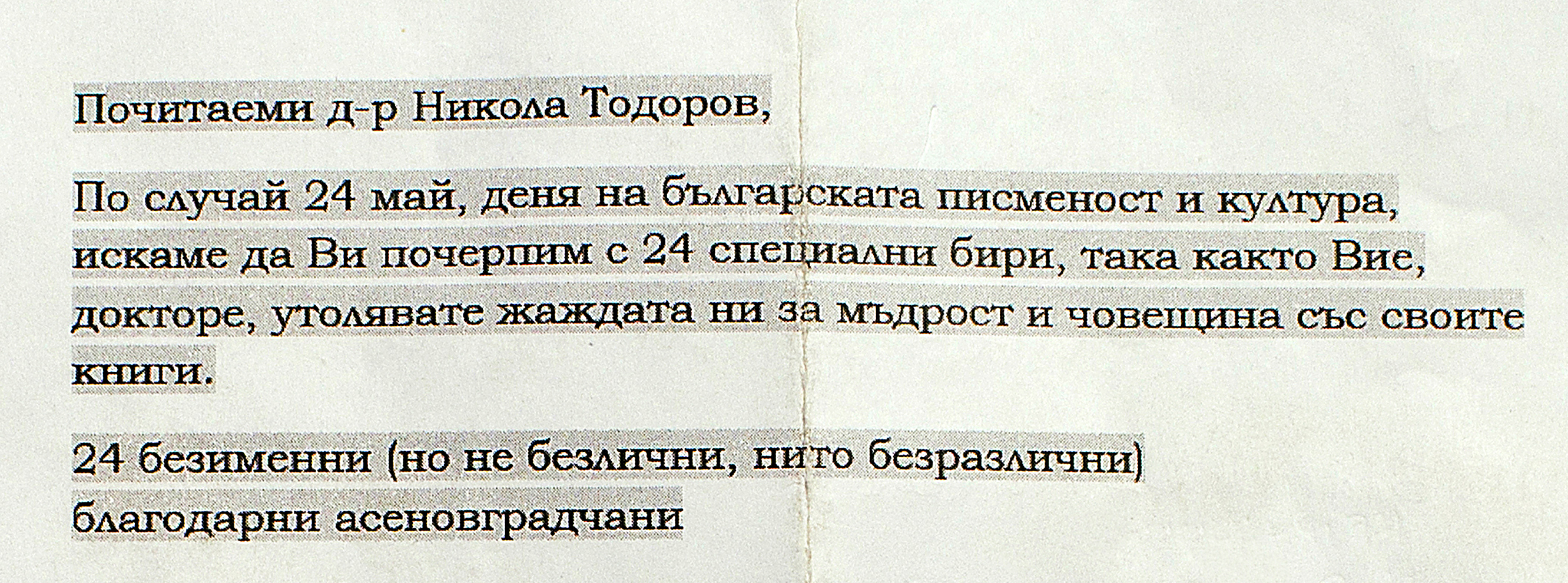 24 души отправят своето послание към него в писмо, прикрепено към колекция от 24 селектирани бутилки бира, които са поставени, за негова приятна изненада, в двора на къщата му точно на 24 май. Числото, както всеки би могъл да предположи, никак не е случайно. Защото д-р Тодоров освен човеците, лекува и душите на хората. Със слово. Със сърце. С мъдрост. С човечност.