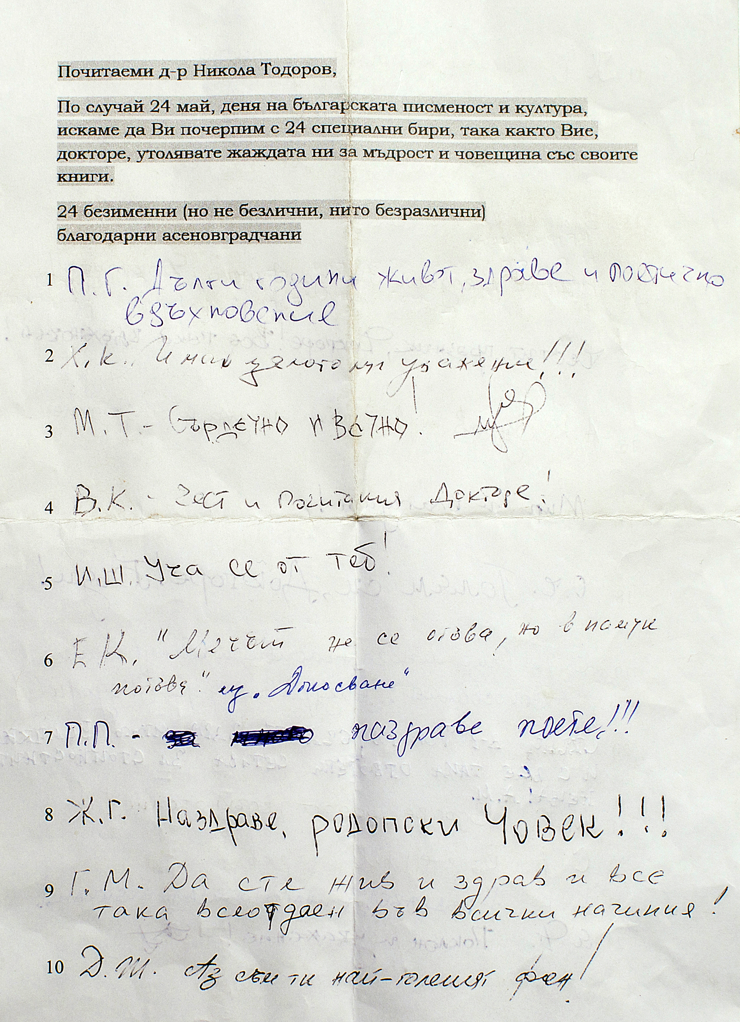 И зад тези 24-ма, подписали се с инициали, застават още много други. Защото всички имаме необходимостта от лично вдъхновение, от добър пример и мъдрост, какъвто неизчерпаем източник е той – родопчанинът с дълбока душа – Никола Тодоров.
