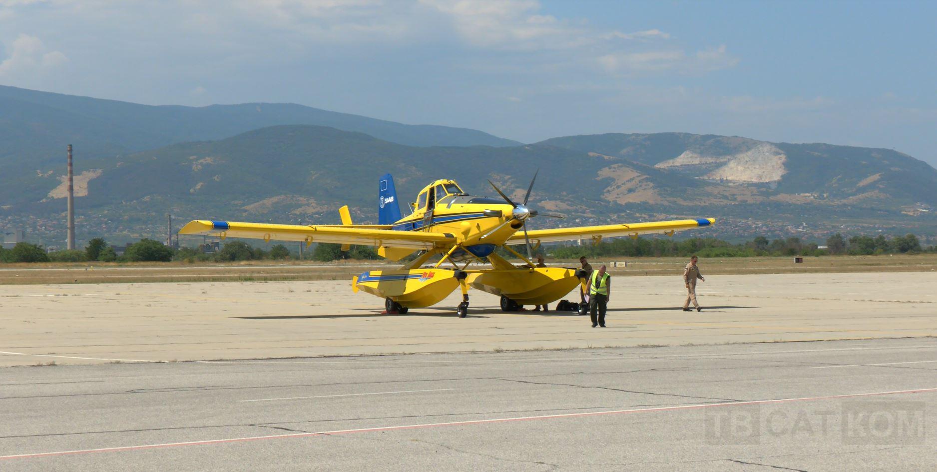 Около обяд на летище Пловдив пристигнаха самолетите от Швеция – малко със закъснение, заради технически проблем, уточни зам.-министърът на вътрешните работи Тони Тодоров на място. По план самолетите трябваше да са тук още сутринта, но престояха известно време в Тимишуара. Веднага след пристигането им на пловдивското летище, те бяха заредени с гориво, след което екипажите им преминаха инструктаж и бяха запознати със ситуацията, преди да отлетят към най-критичната точка в страната на този етап, както я определи вътрешният министър – това е пожарът в община Струмяни. Още в сутрешните часове 6 хеликоптера бяха насочени натам. Във връзка с широкия фронт на пожара, който почти достигна село Плоски и това наложи евакуиране на жителите на населеното място, зам.-министърът уточни, че ураганният вятър снощи е усложнил ситуацията, но благодарение на общите усилия, на пожарникари и доброволци, пламъците са ограничени на метри от селото.