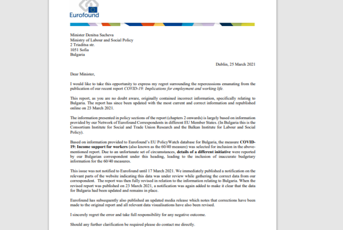 Европейската фондация за подобряване на условията на живот и труд (Юрофаунд) коригира данните за България в изследването за влиянието на пандемията от Ковид-19 върху заетостта и трудовия живот в ЕС. Причината е, че в първоначално публикувания на 11 март доклад е съдържал некоректна информация за страната ни. Ревизираните данни за България са публикувани на 23 март на сайта на Юрофаунд . За това информира изпълняващият длъжността директор на Еврофондацията Мария Йепсен в писмо до министъра на труда и социалната политика Деница Сачева.